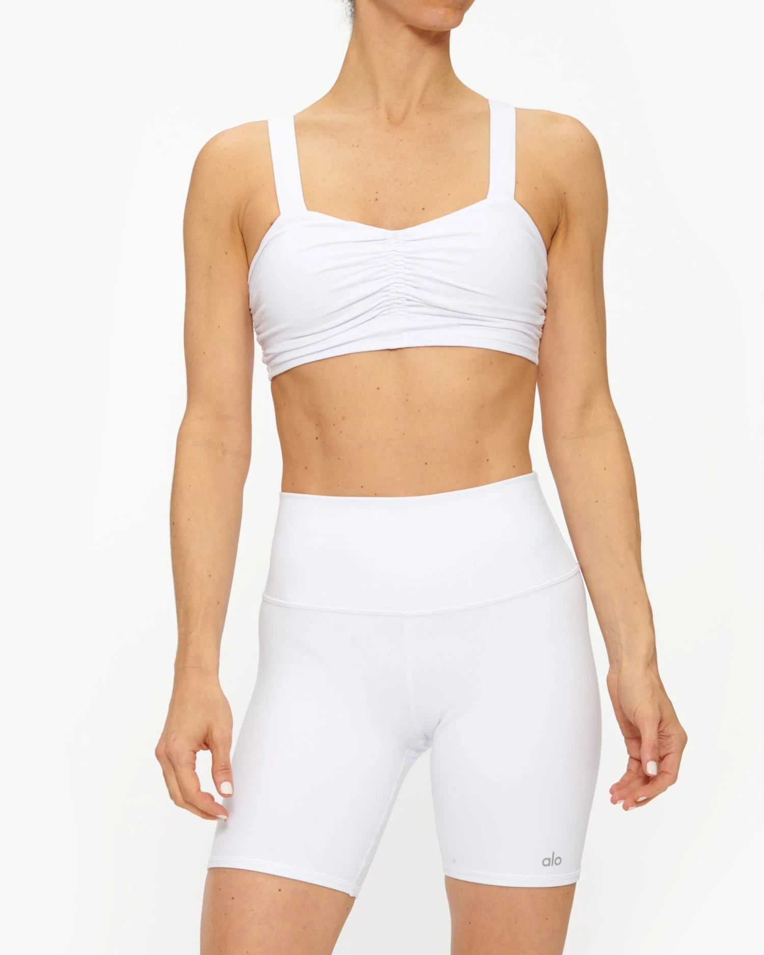 The very versatile Airbrush Cinch Bra is the light-to-medium support you’ve been looking for to put together solo statement looks or sweet layered outfits. With a sweetheart neckline, front and side ruching and straight straps, this looks so right peeking out from under an unzipped hoodie or paired with high-waist shorts.