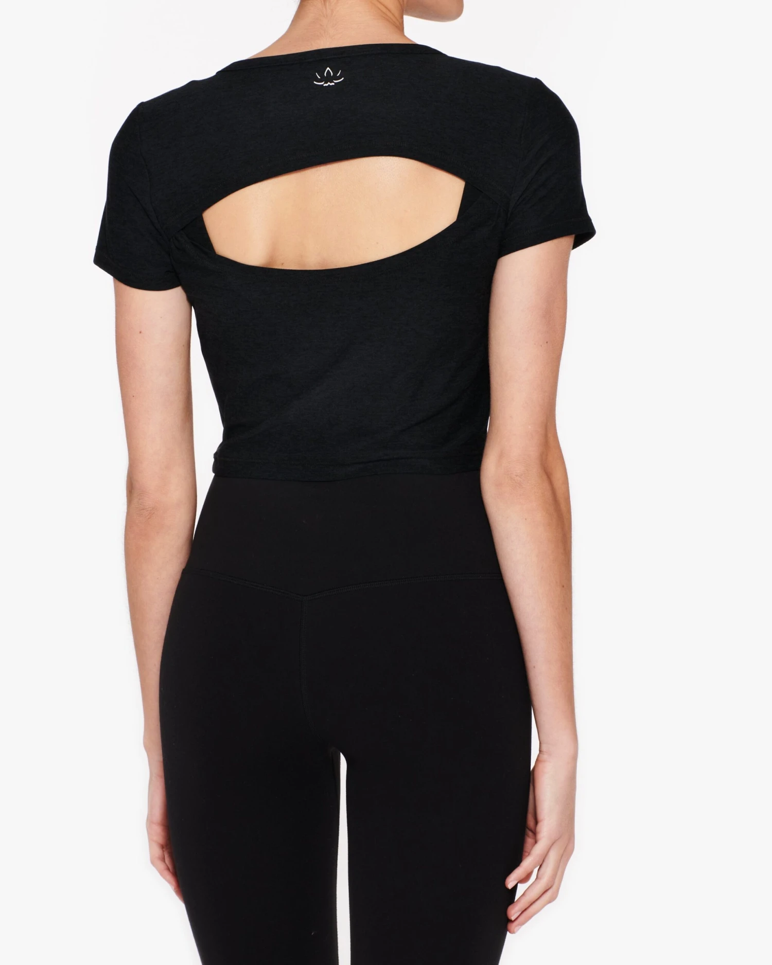 A new outlook on softness through an open back tee that shows off the back of your favorite Spacedye bra. Get a fresh perspective on your routine in this versatile, active-to-out and about cutout cropped tee that looks great with both high waisted shorts and leggings, and your favorite pair of jeans.