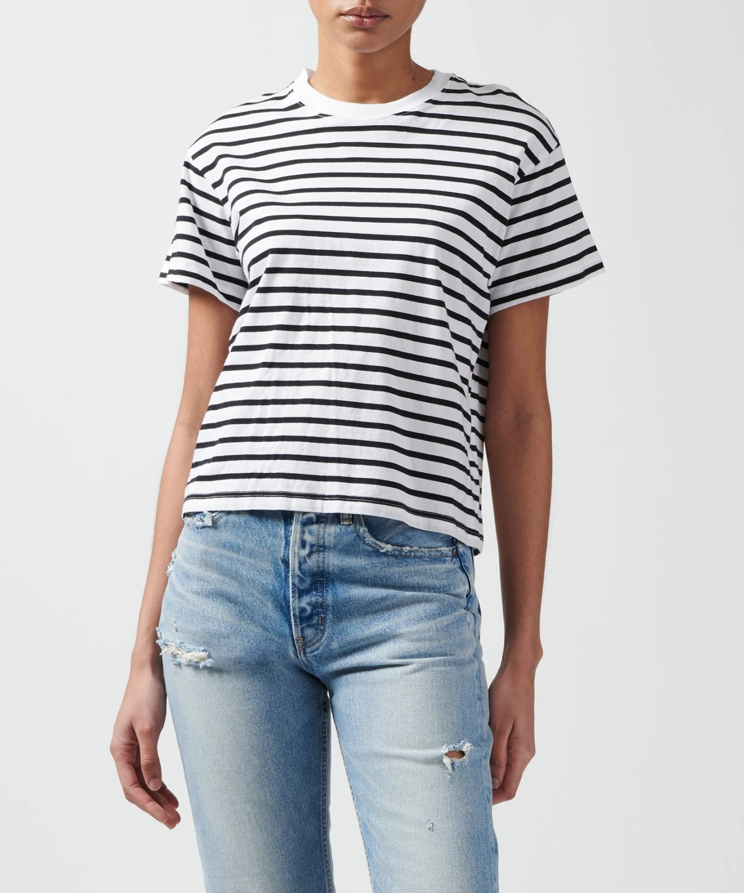 The Classic Jersey Short Sleeve Boy Tee is done in a luxe cotton jersey. It combines the weight and shape of a men’s piece with the fit of a women’s tee. It features a slightly cropped, boxy shape with longer and wider cut sleeves. The classic piece is updated with a black and white stripe print and white contrast collar.