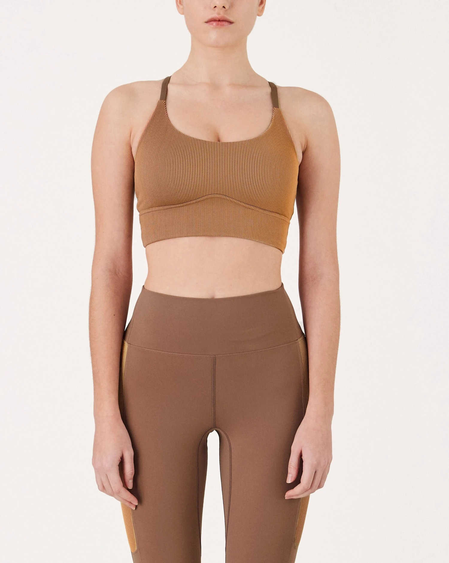 A high coverage, supportive bra top featuring a scoop neck, a longer bottom band, and a Y-strap back. Fabricated with our signature two-toned ribbed material, the Kaya Bra Top gives off a unique color-changing effect from different angles. Fit for sweaty workout sessions and making a (subtle) statement at the gym.