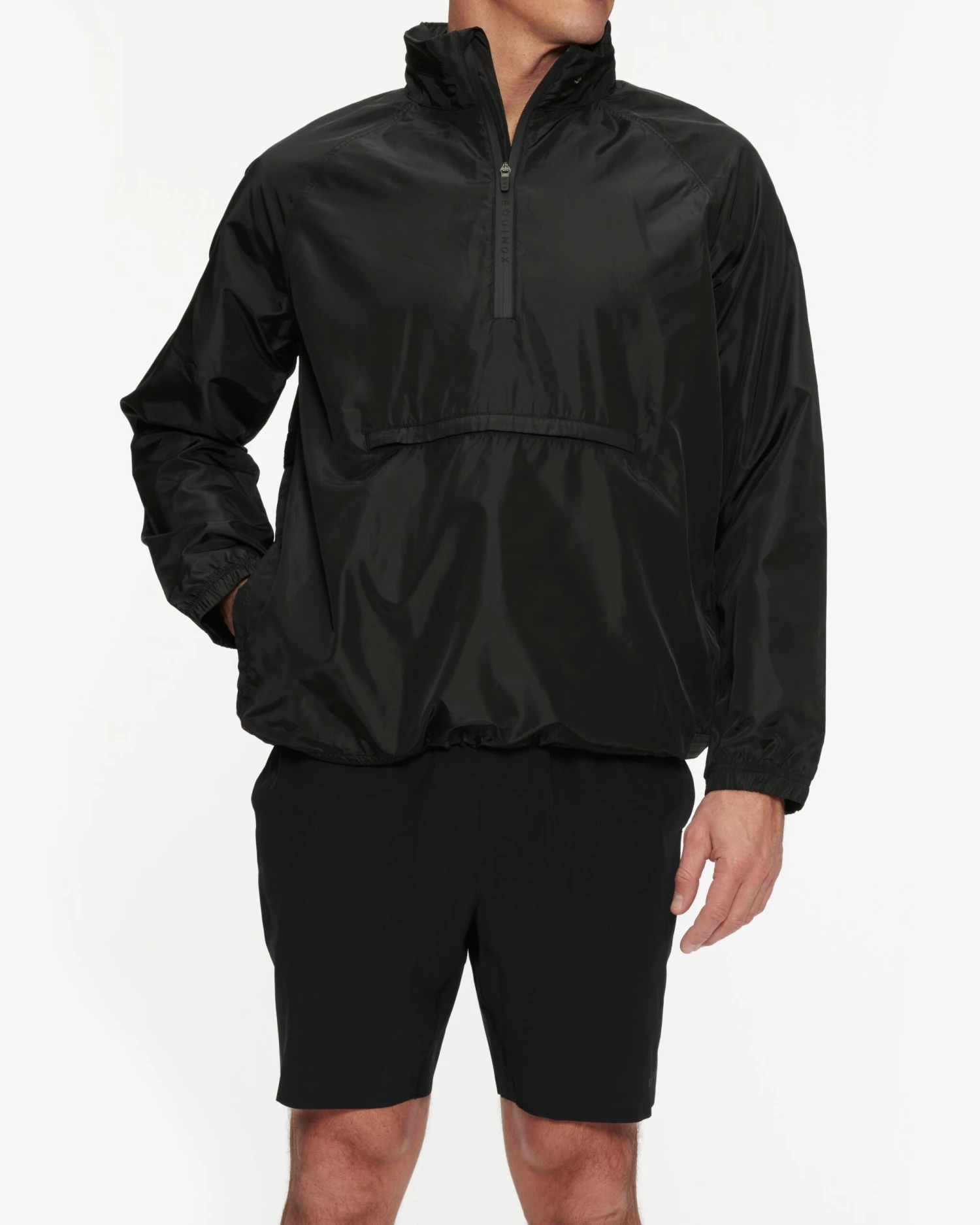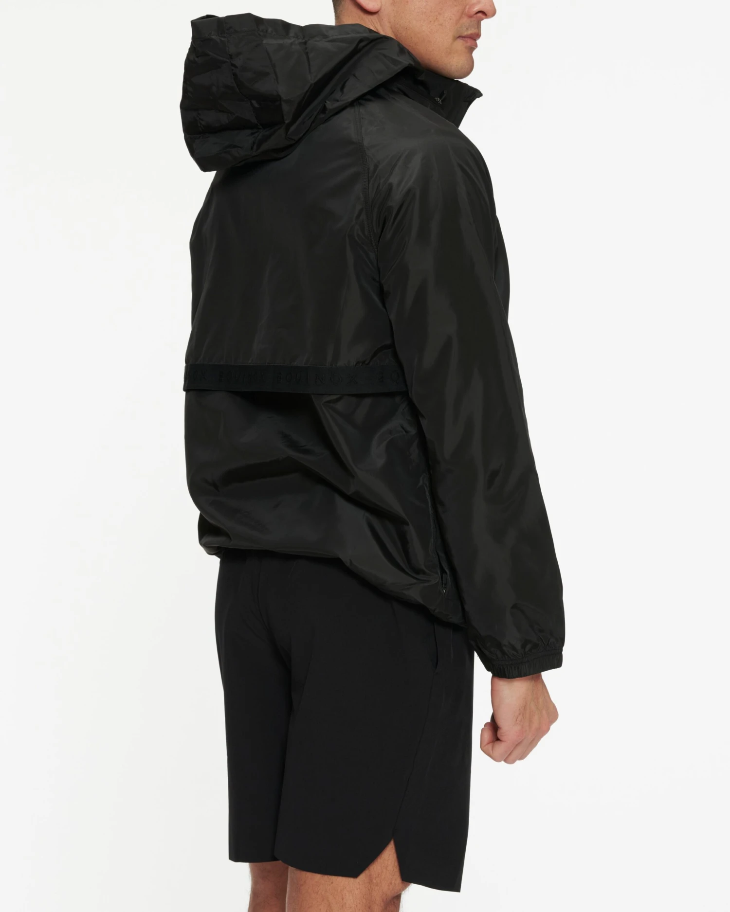 A classic woven anorak jacket, built for movement and truly a perfected fit. It’s water repellent, with an internal adjustable bungee cord, underarm ventilation, and a hidden hood so you’re never caught off guard in the elements. Our Equinox logo is custom embossed on a jacquard elastic at back yoke for subtle branding.