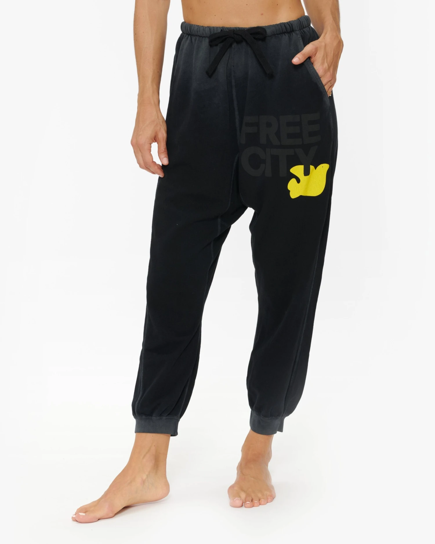 This unisex SUPERVINTAGE POCKET sweatpant features a custom sunfade dye process (highs and lows), “FREECITYLARGE” print in black, and a yellow “FREECITYDOVE.” Sweatpants have a drawstring at waist, slant hip pockets, and back patch pocket.
