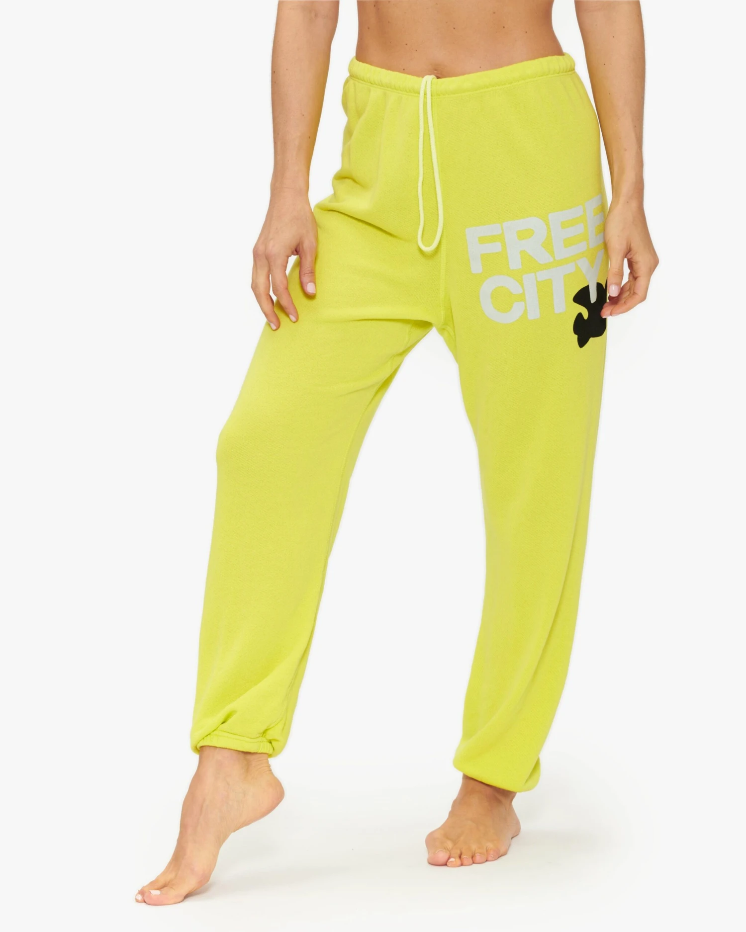 This unisex SUPERFLUFF LUX OG sweatpant features a classic “FREECITYLARGE” print, black “FREECITYDOVE,” and covered elastic waist band with pull drawstring.