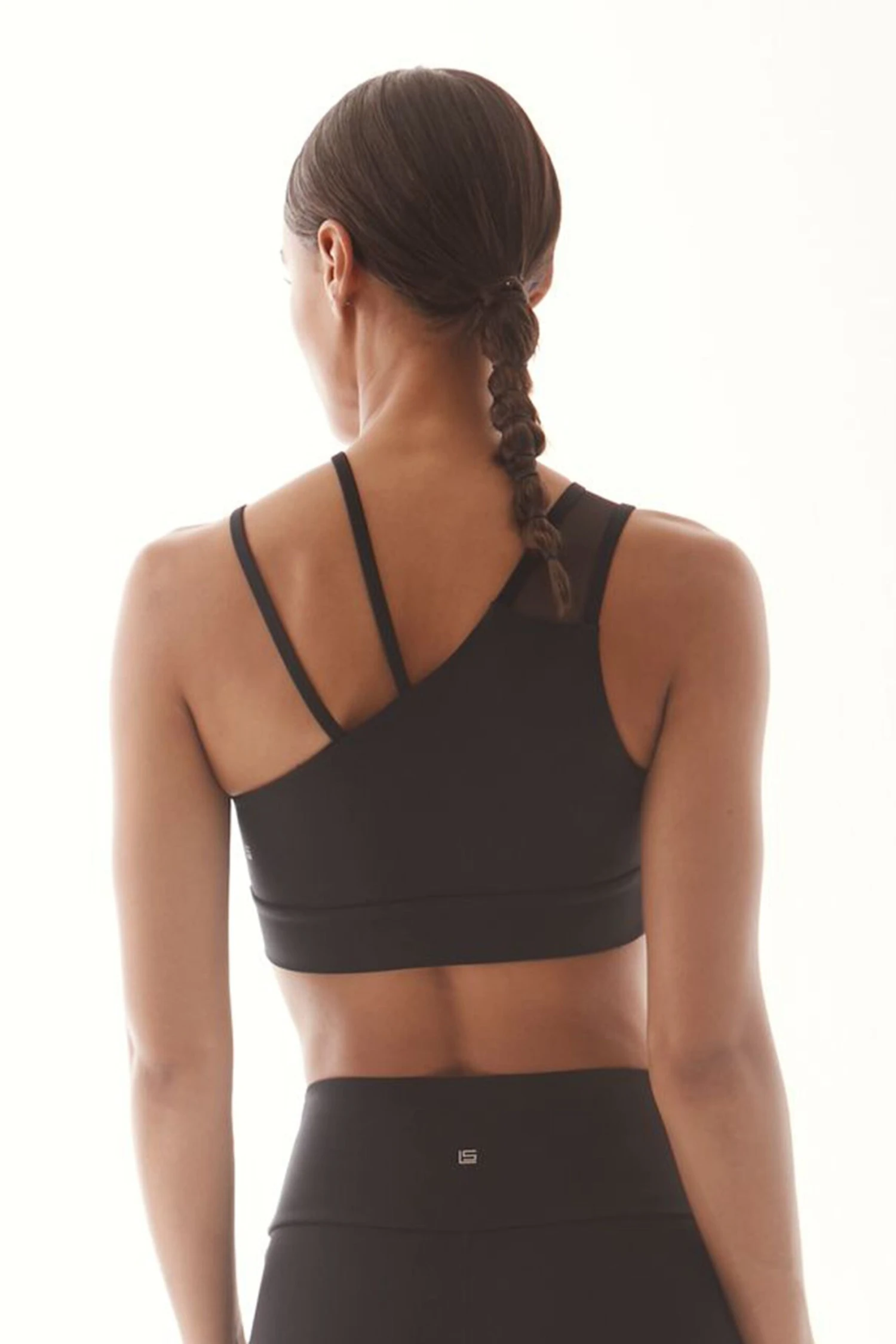 Black sports bra with double straps on one side with an overlaying micro-mesh panel that forms a strap on the other side. This sustainable bra features asymmetrical double straps on one side with an overlaying micro-mesh panel that forms a strap on the other side.