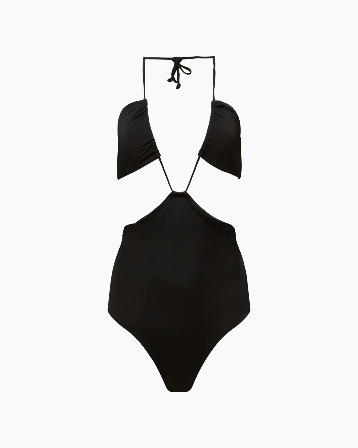 Our sculpting Micro Strap Bandeau One Piece comes in nylon spandex tricot with ruched cups framing a front cutout. It’s fully lined with a standard leg opening and slim halterneck straps that tie in the back.