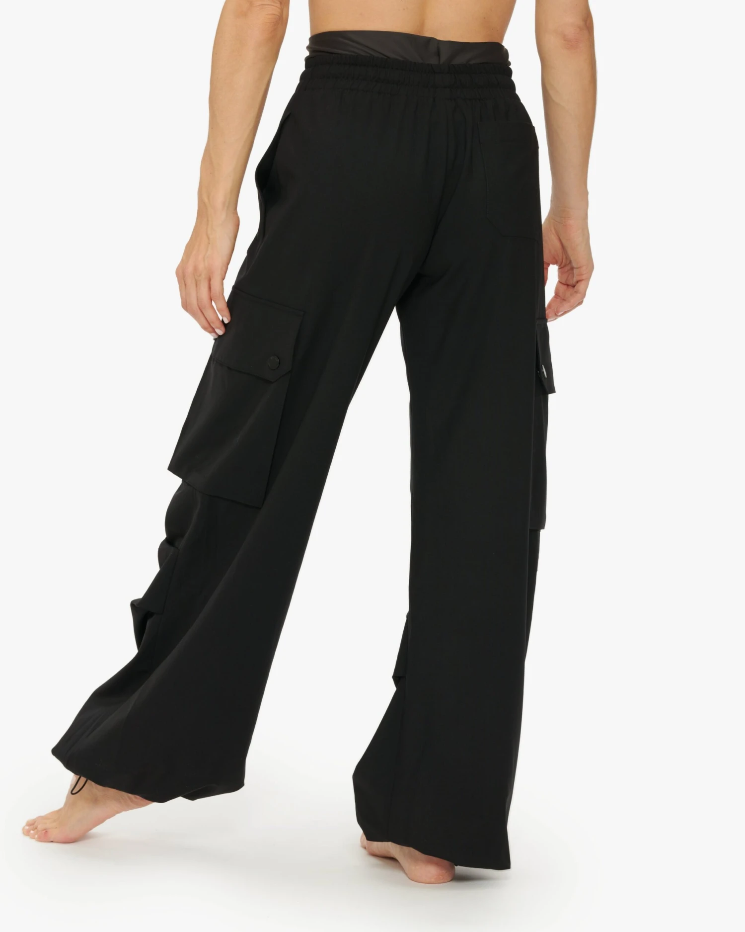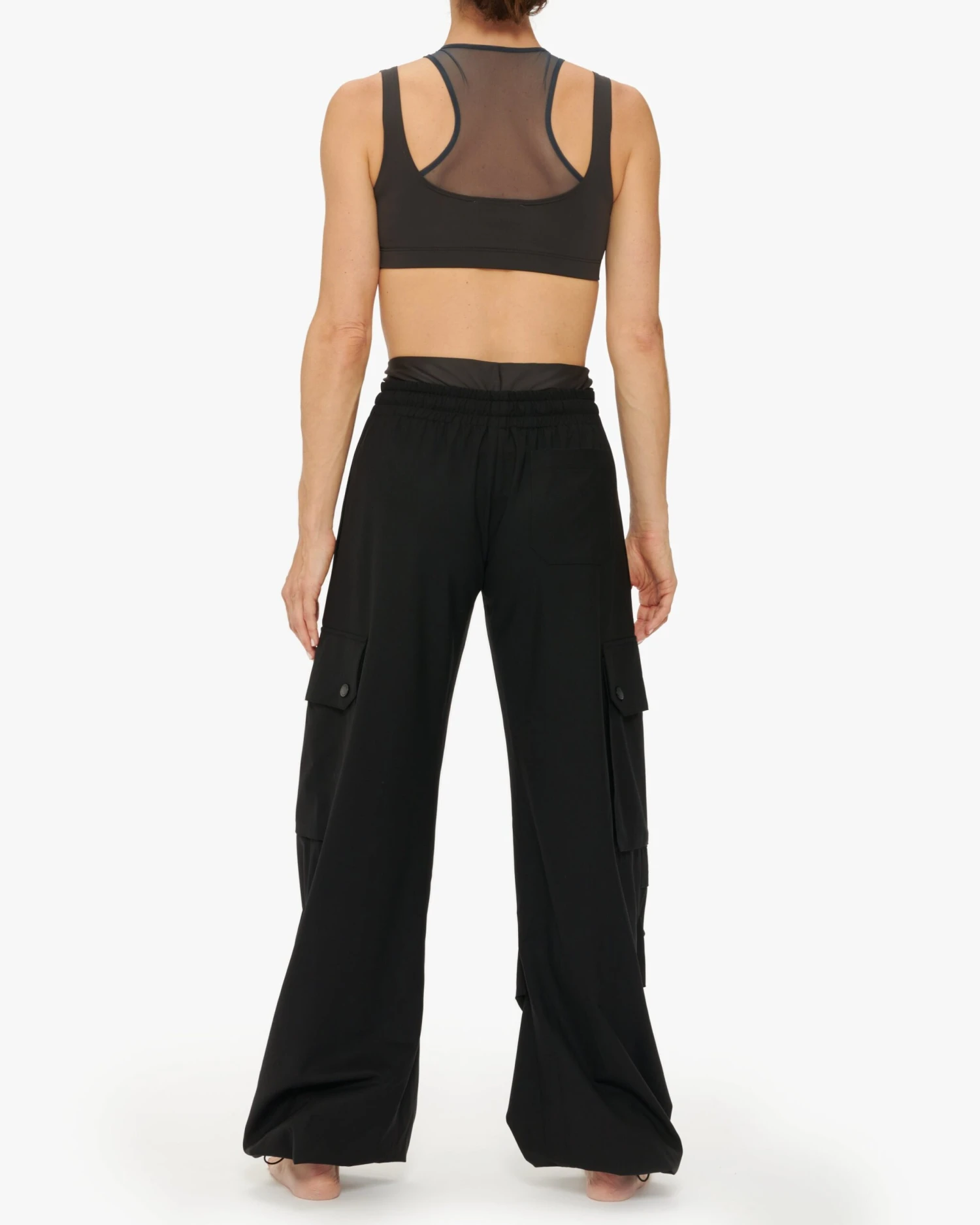 Precious cargo. The MONSE Combo Parachute Pants are loose fitting, mid rise cargo style pants with a ruched wide leg, crafted from both Wool Gabardine and Vita Power Jersey that features 78% recycled polyamide made from fish net. Designed with a jersey double waistband and branded logo, the style features side, front and back pockets and cord stoppers. Finish the look with the MONSE Maeby Tube Top.