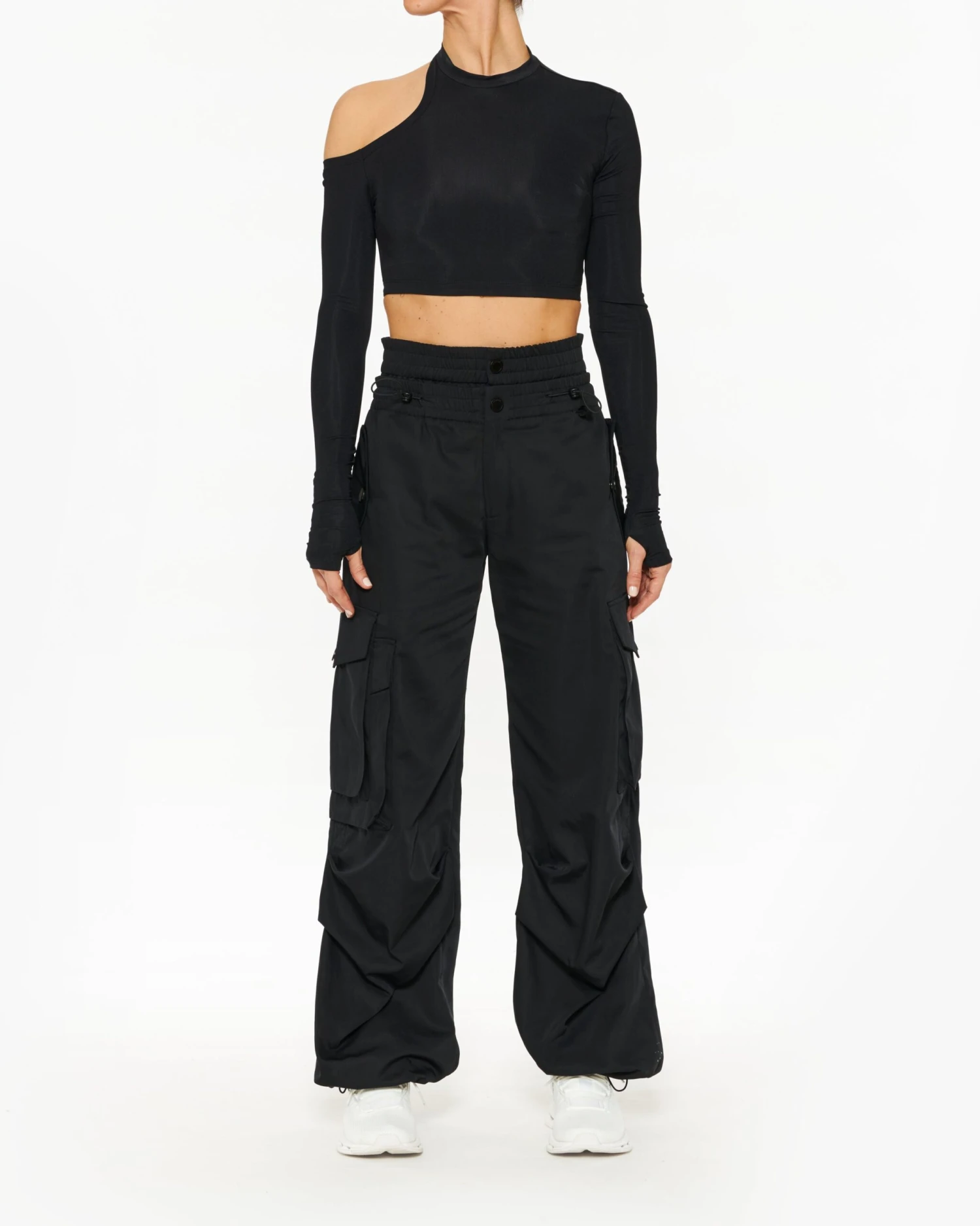 The MONSE Long Sleeve Cut Out Crop Top will be your go to athleisure piece in your closet. Fall in love with exposed shoulder and logo detailing along the back.