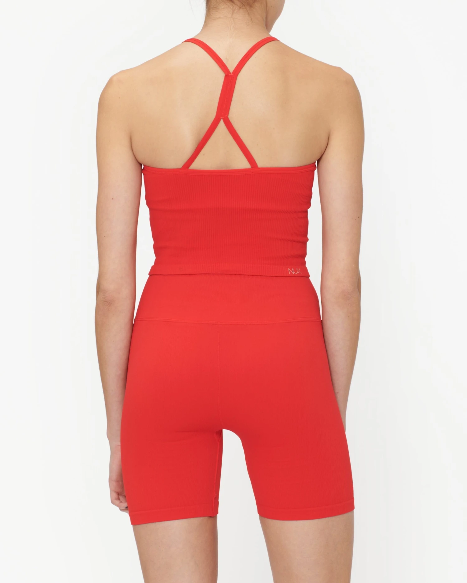 The curvilinear design and slender racerback offer a functional support while the soft fabric made from recycled yarns.
