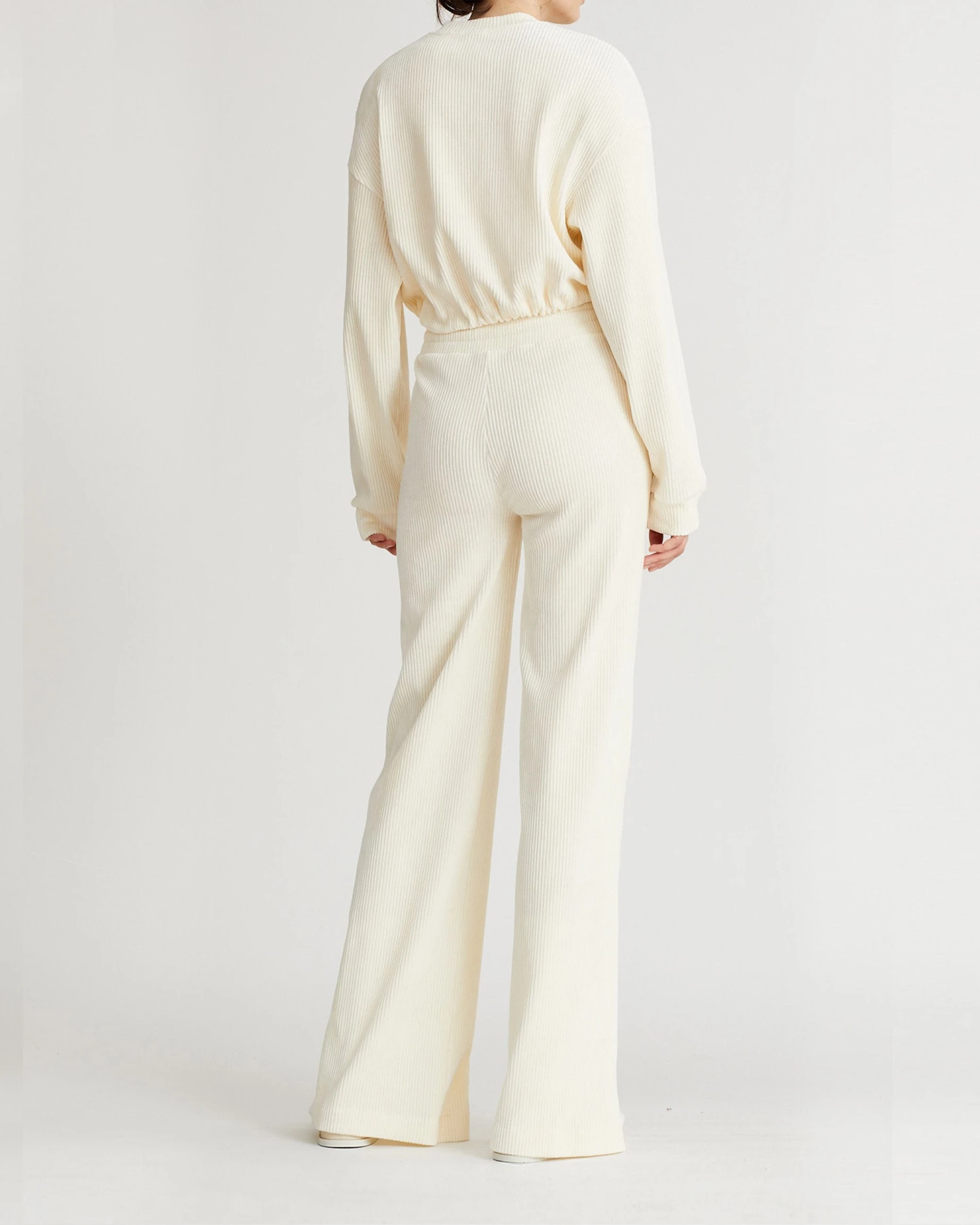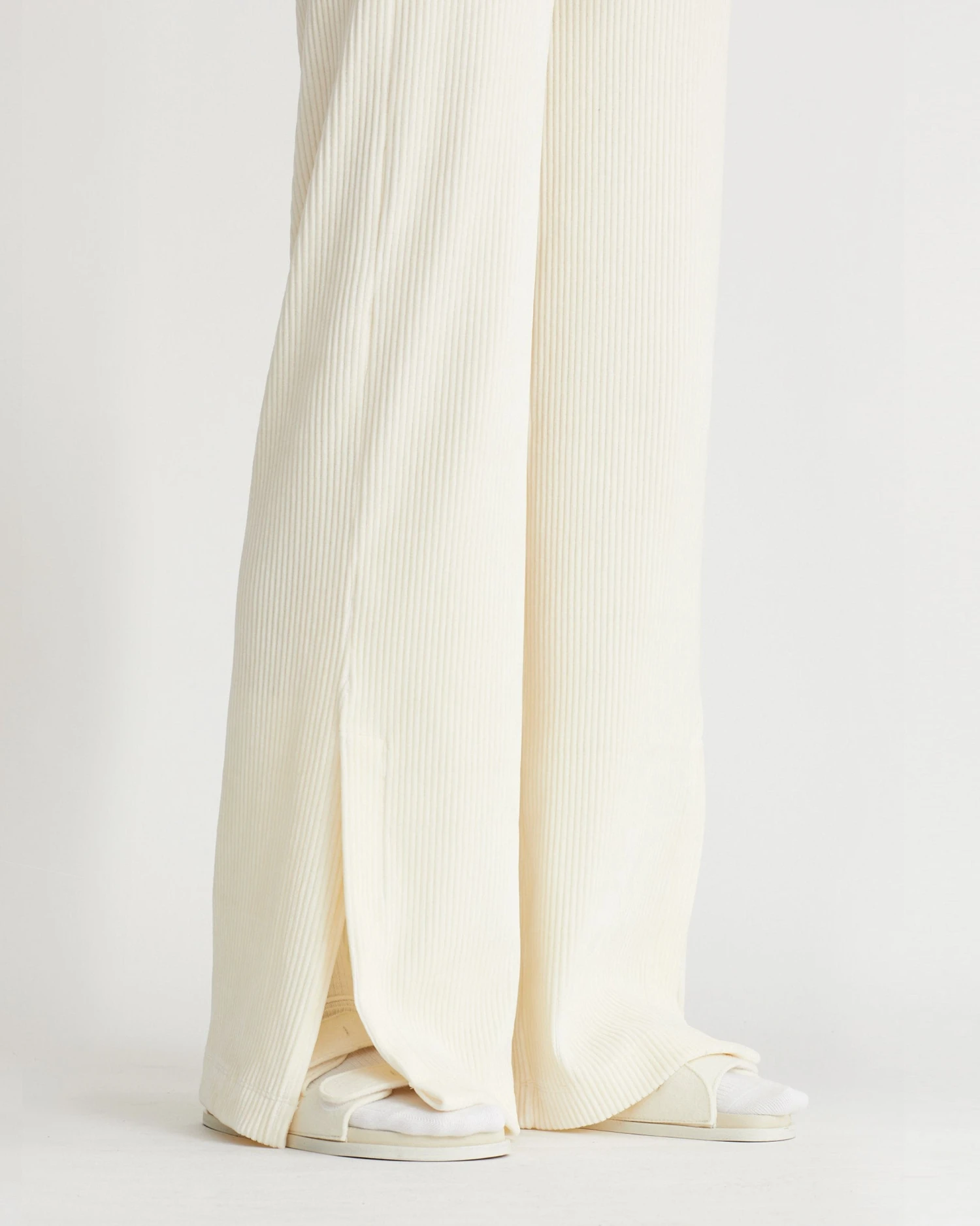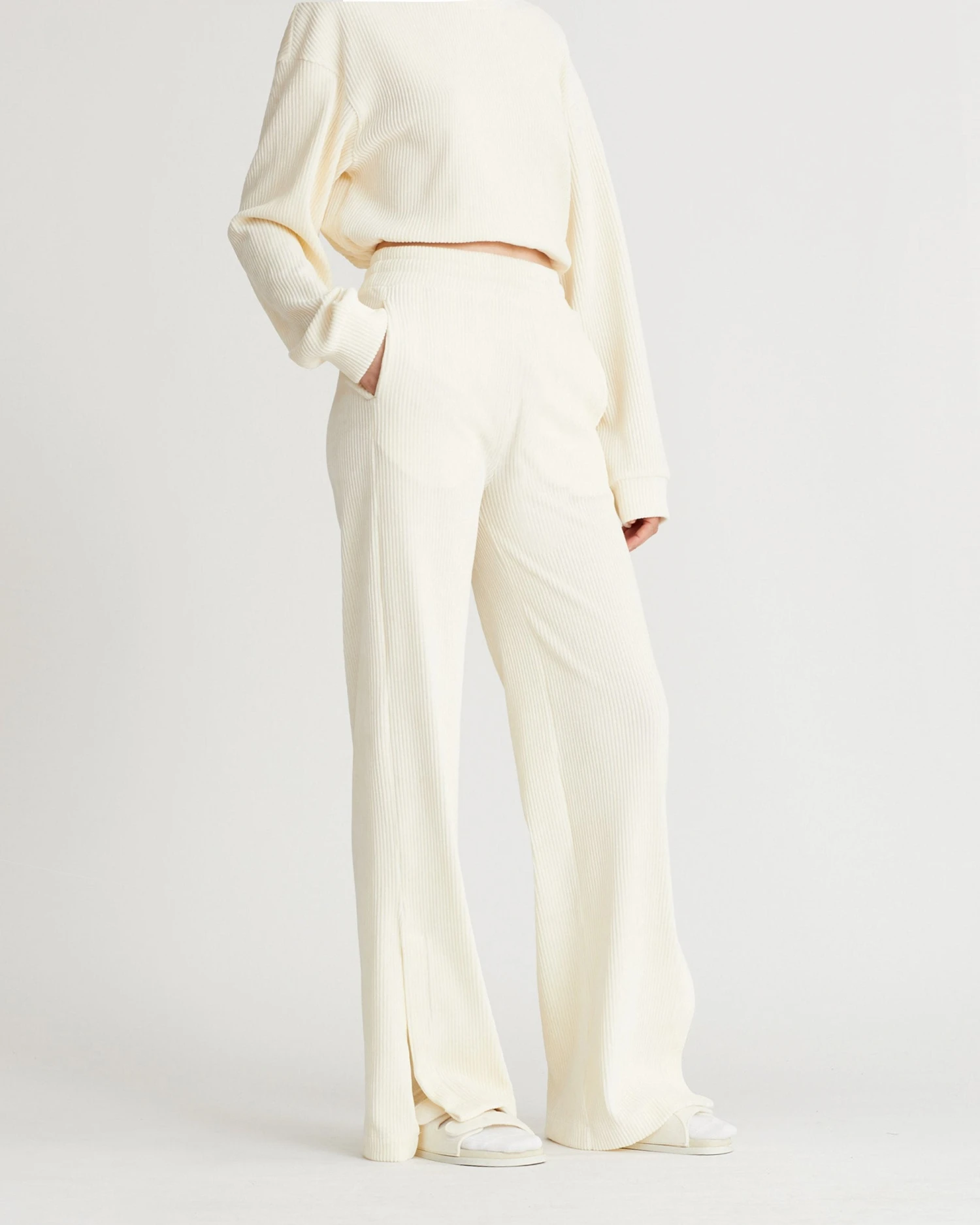 Nylora’s Arie Pants are made in a super soft velour corduroy fabric and feature a wide fit with a side slit detail at hem and an internal elastic band at waist.