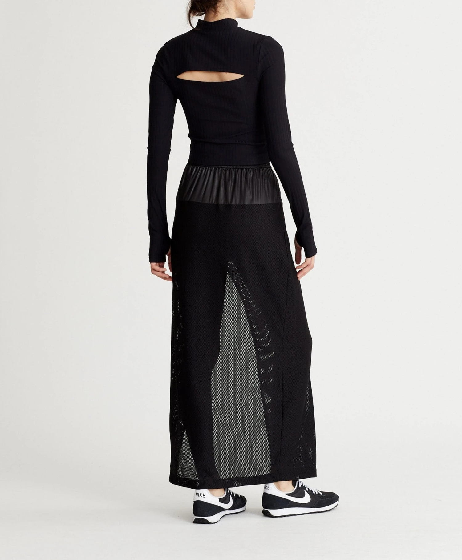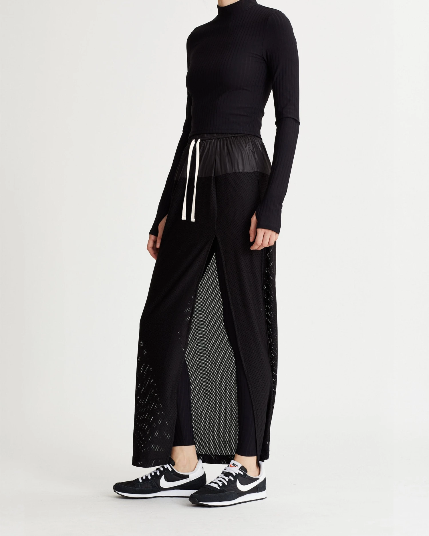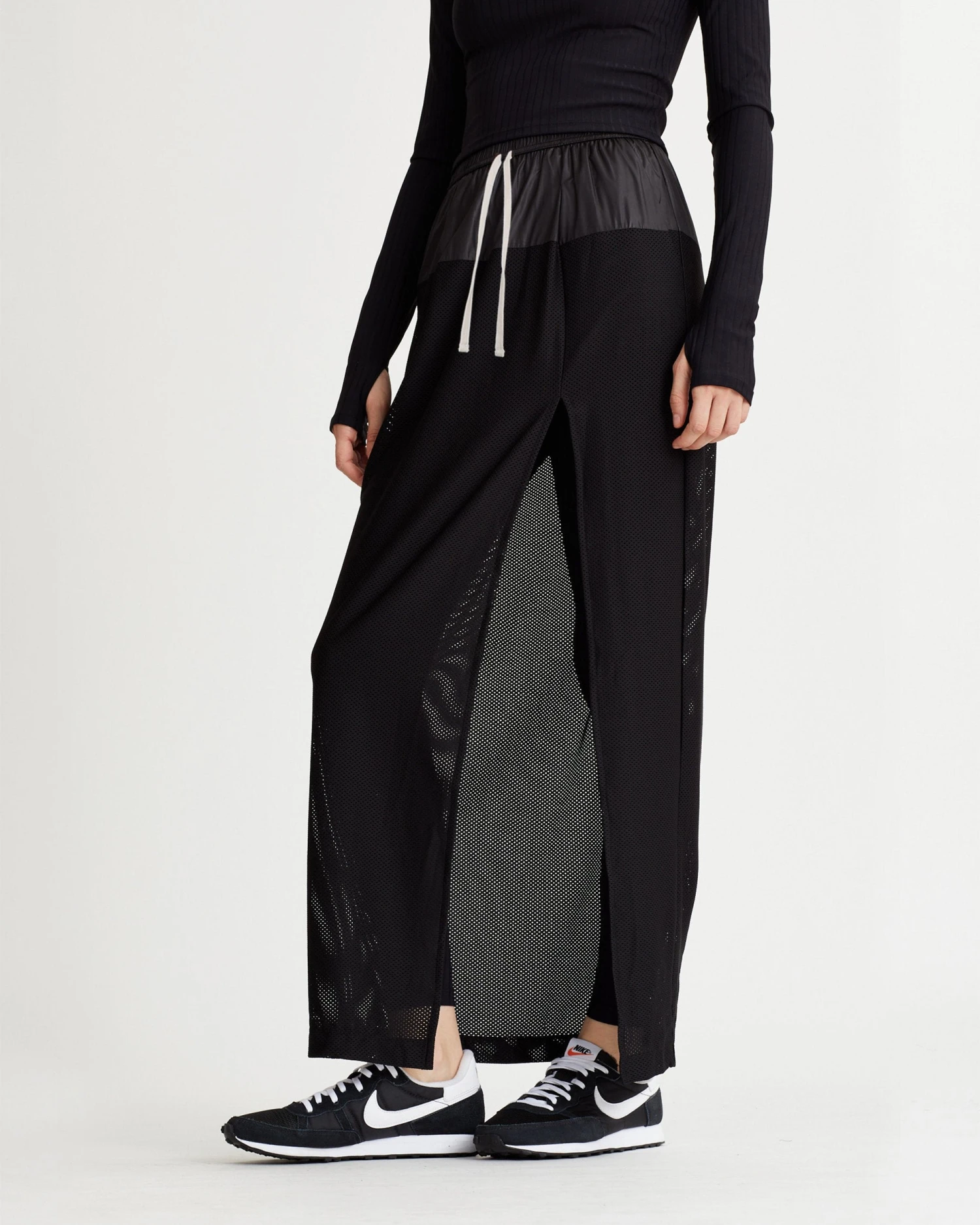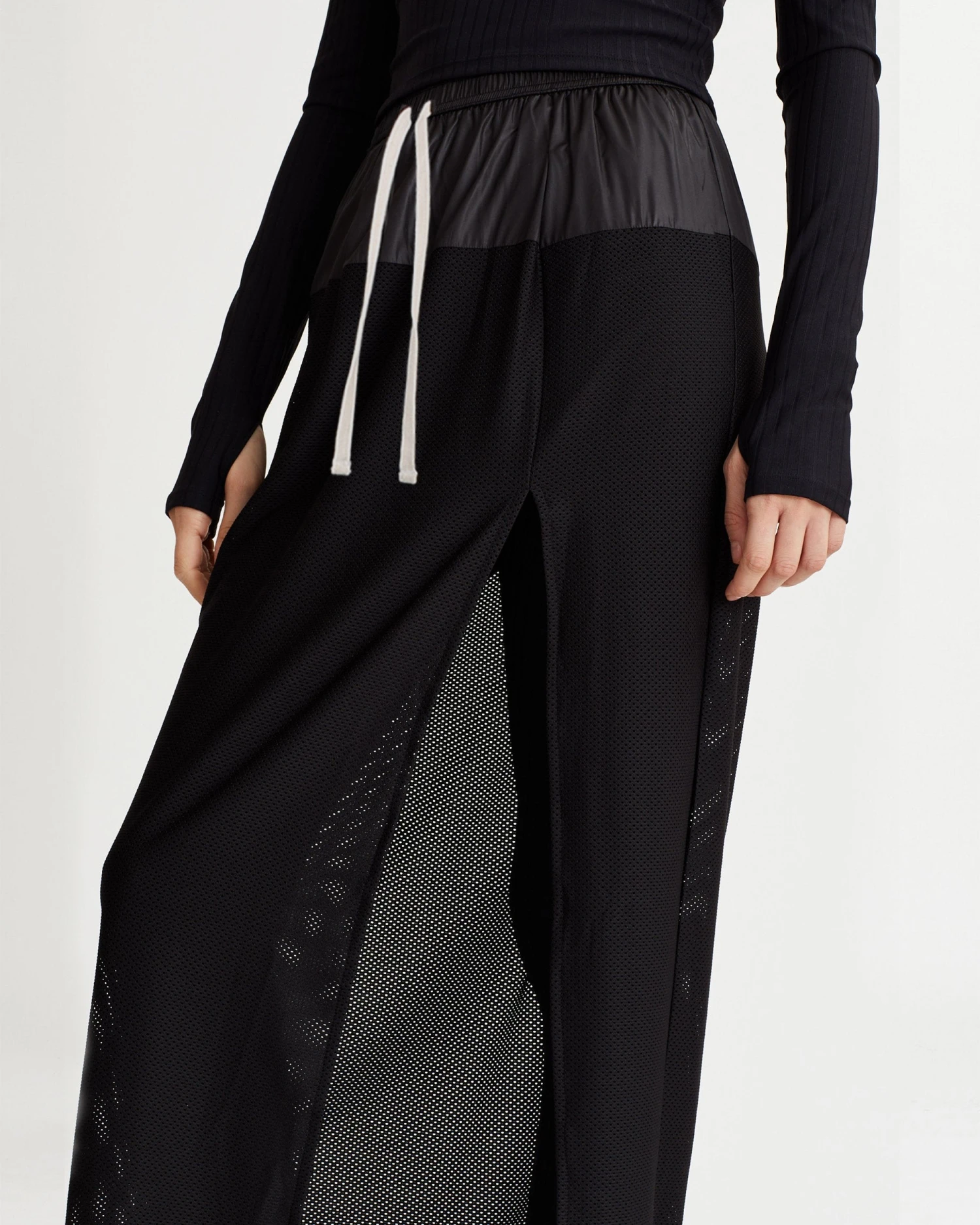 Nylora’s Lusso Mesh Combo Skirt has a drawstring at the waist, Nylora’s signature mesh fabric with woven panel details, and a side slit detail on one side.