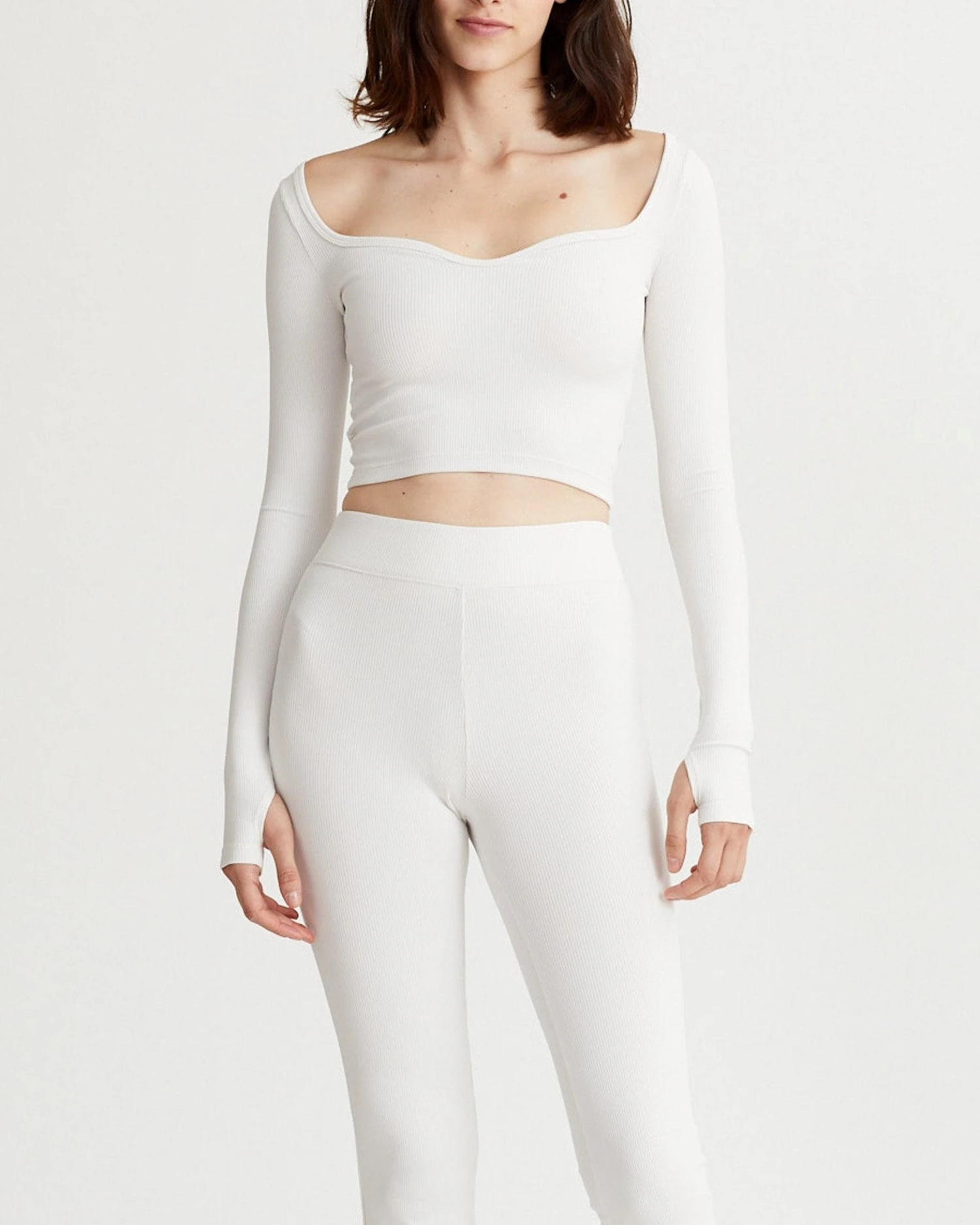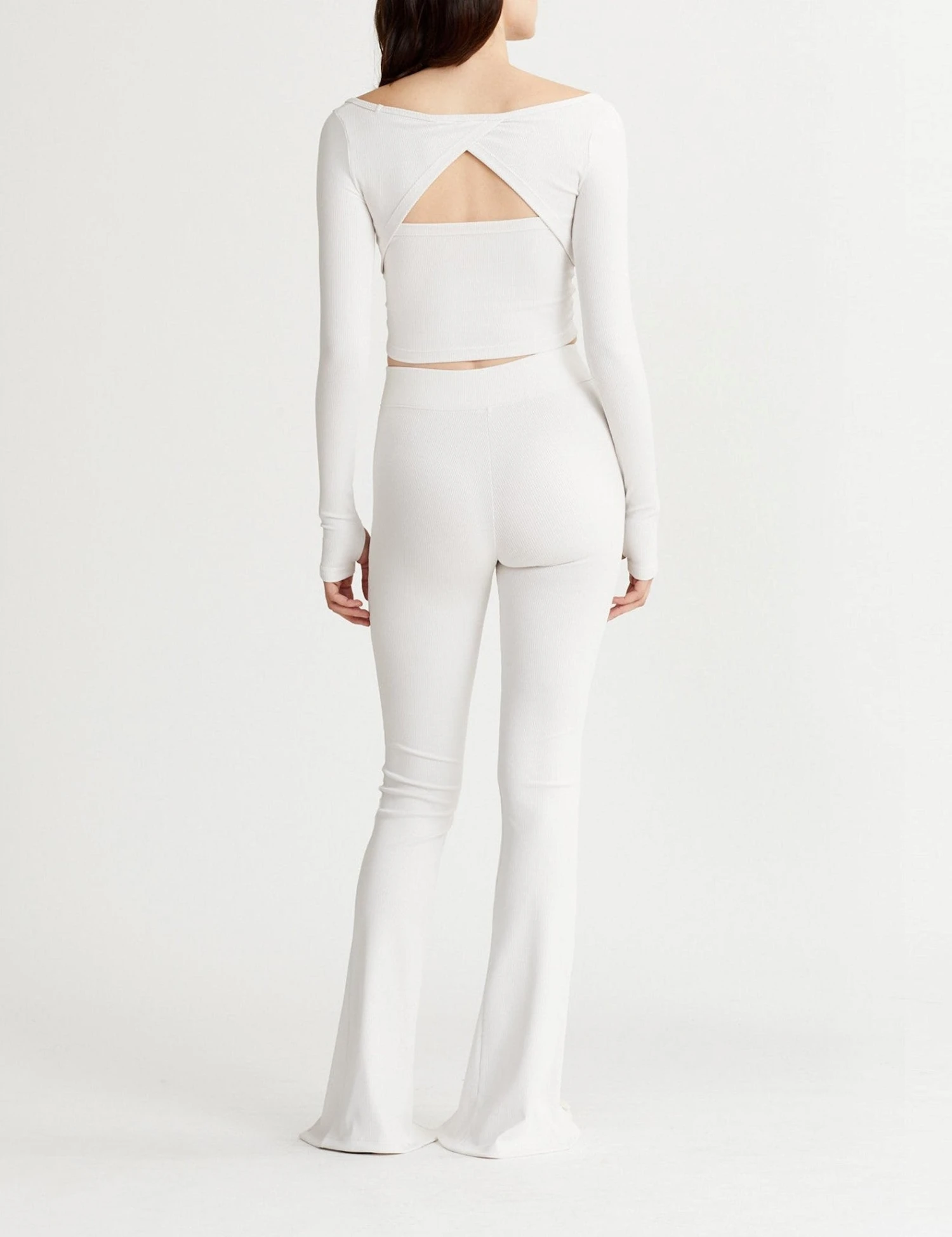 Nylora’s Talia Top is fitted with feminine necklines, a cutout overlap detailing in back, thumbholes, and stretchy 2×2 ribbed fabric.