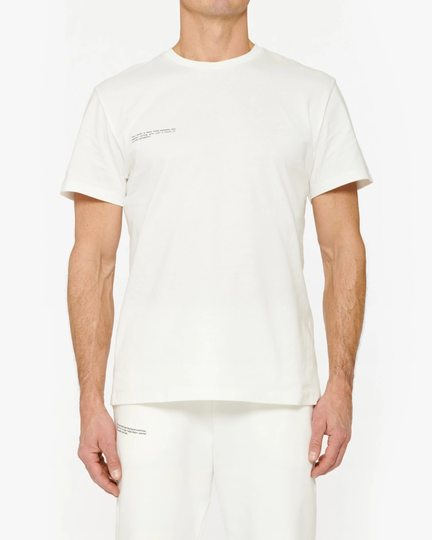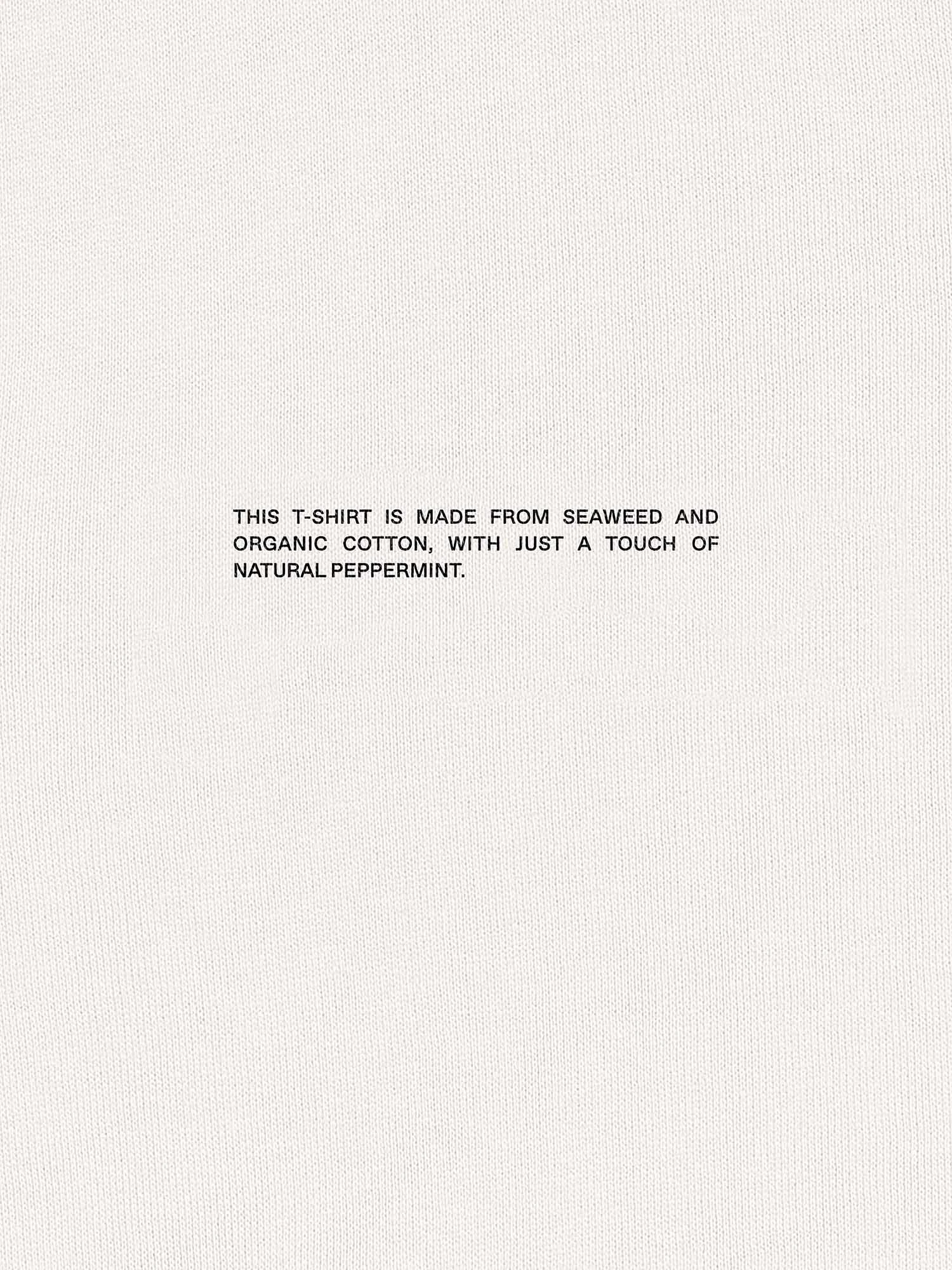 This Off-White T-Shirt is made with saltwater Seaweed Fiber, Organic Cotton, and treated with PANGAIA’s trademark technology: PPRMINT™ oil. PPRMINT™ has natural antibacterial and antimicrobial properties to keep your T-shirt fresh for longer, meaning it can be washed less often—saving water, energy and time.