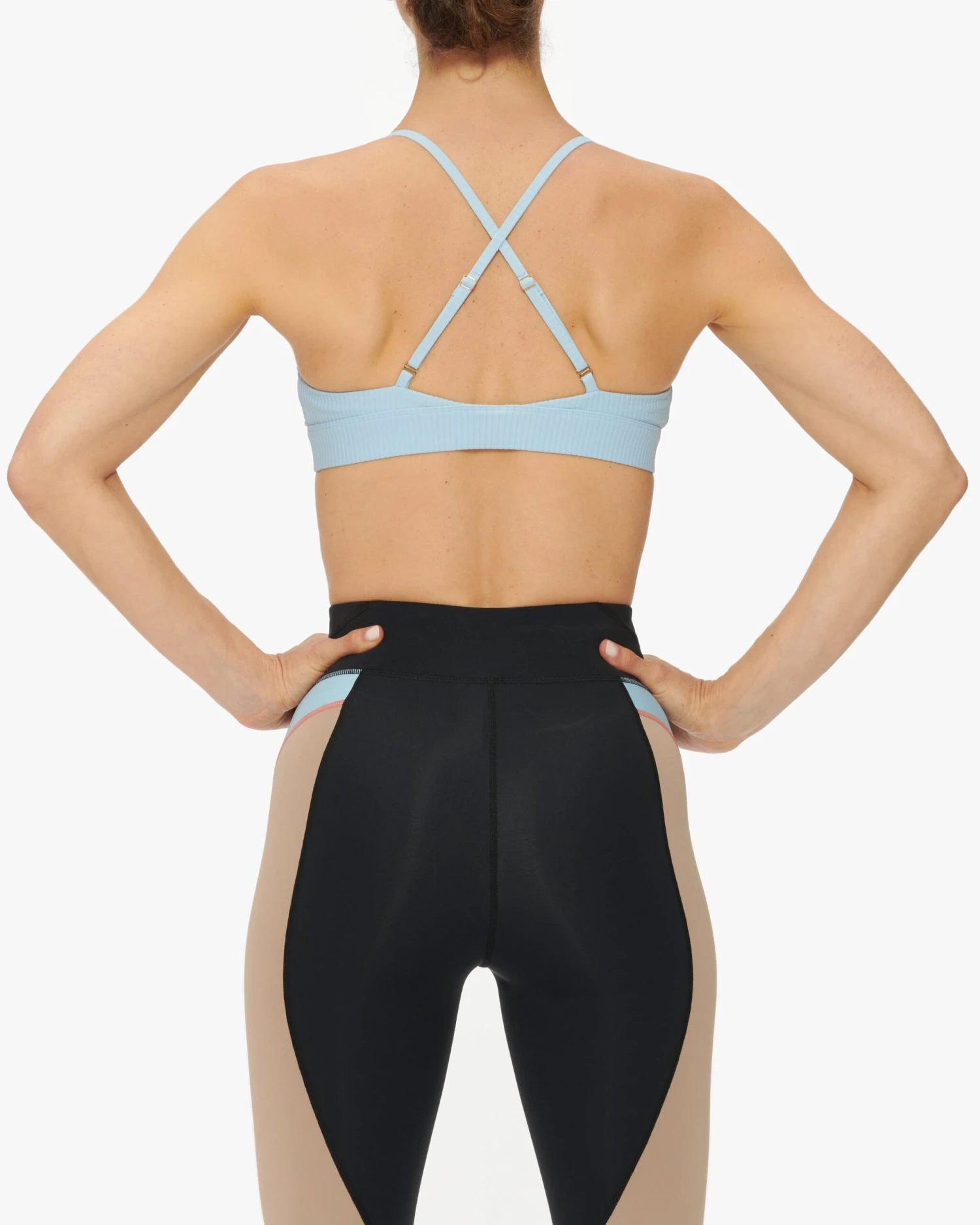 A lightweight V-neck leisure crop with a delicate bralette silhouette, featuring adjustable criss-cross strap detail on the back with gold-plated hardware sliders.