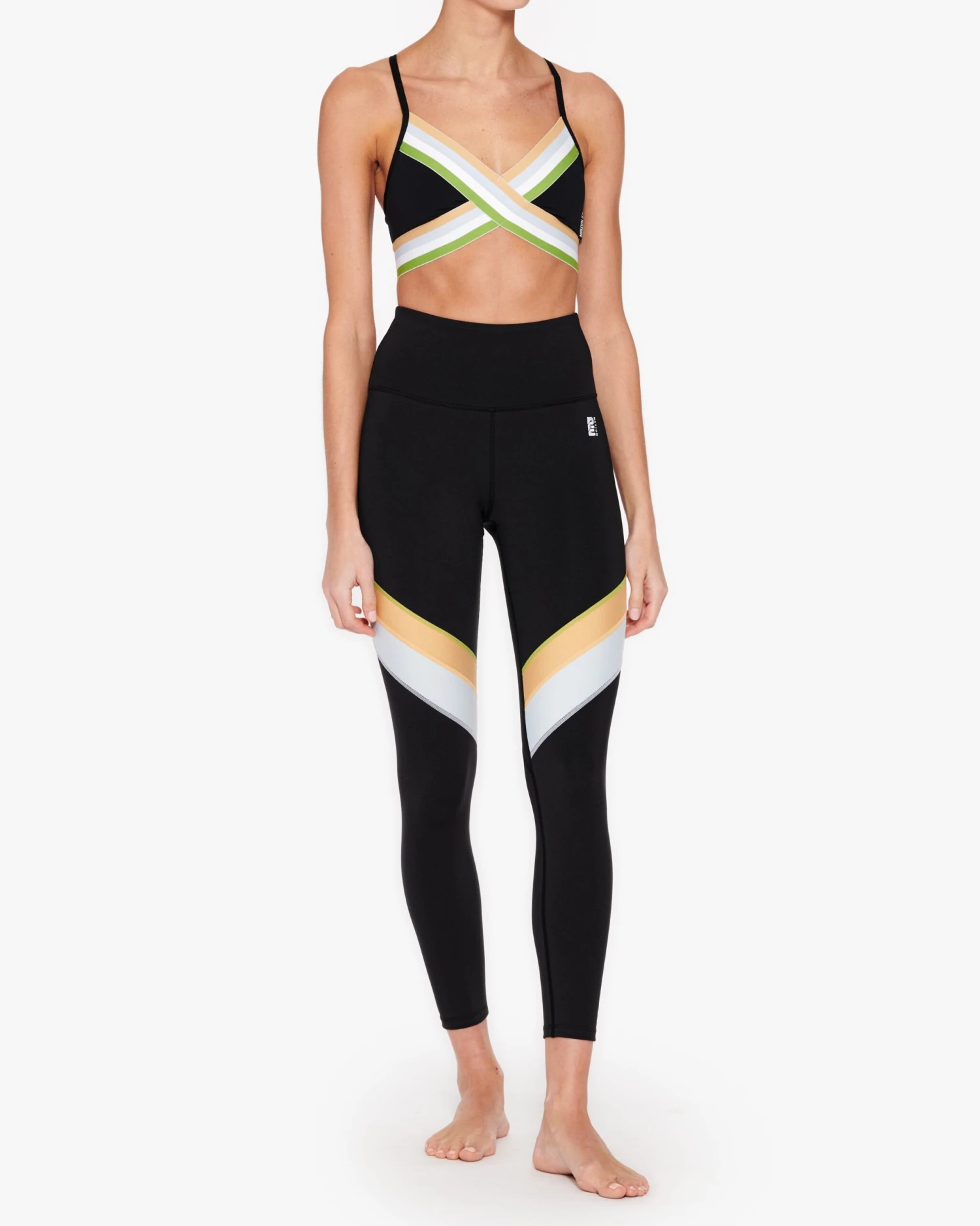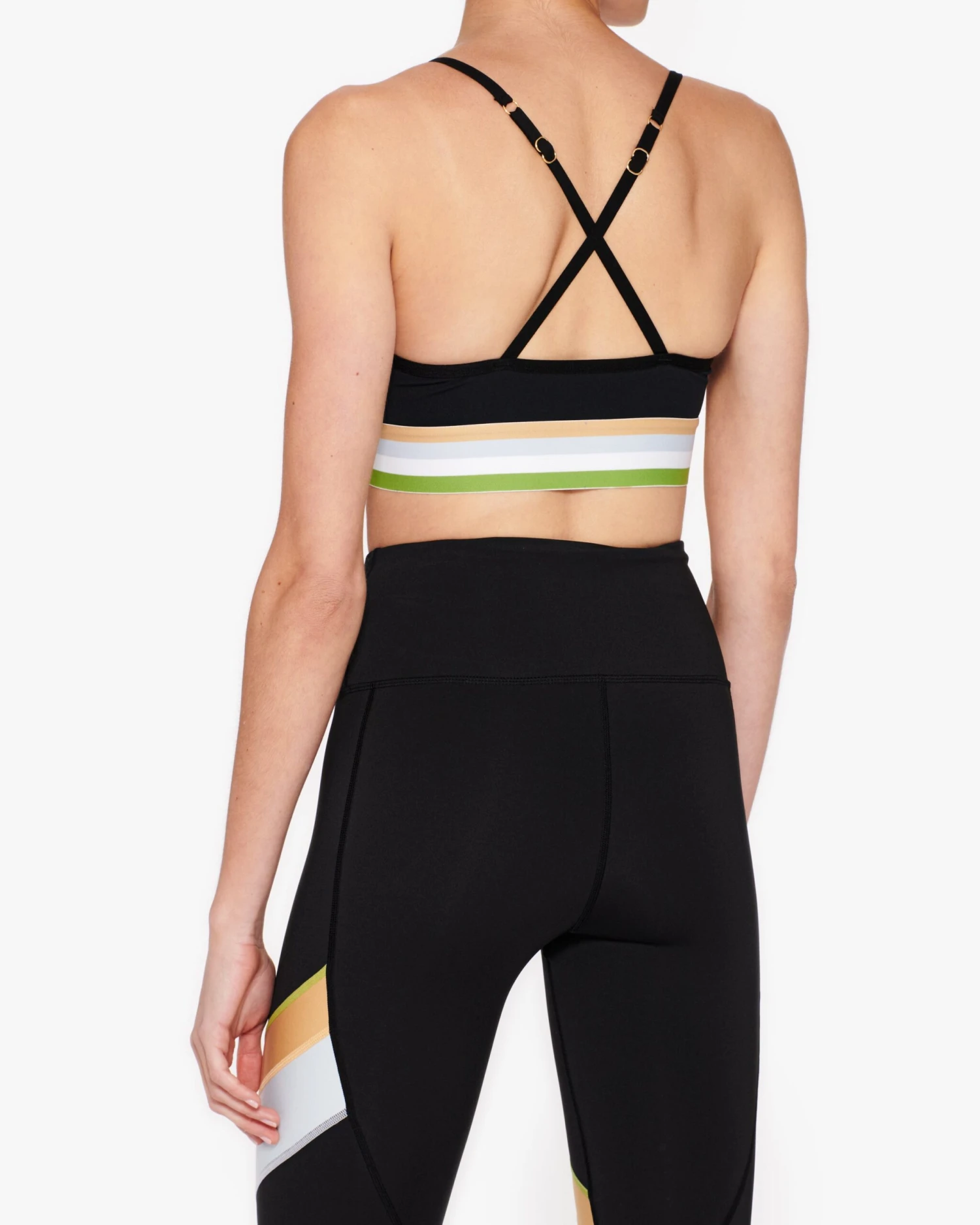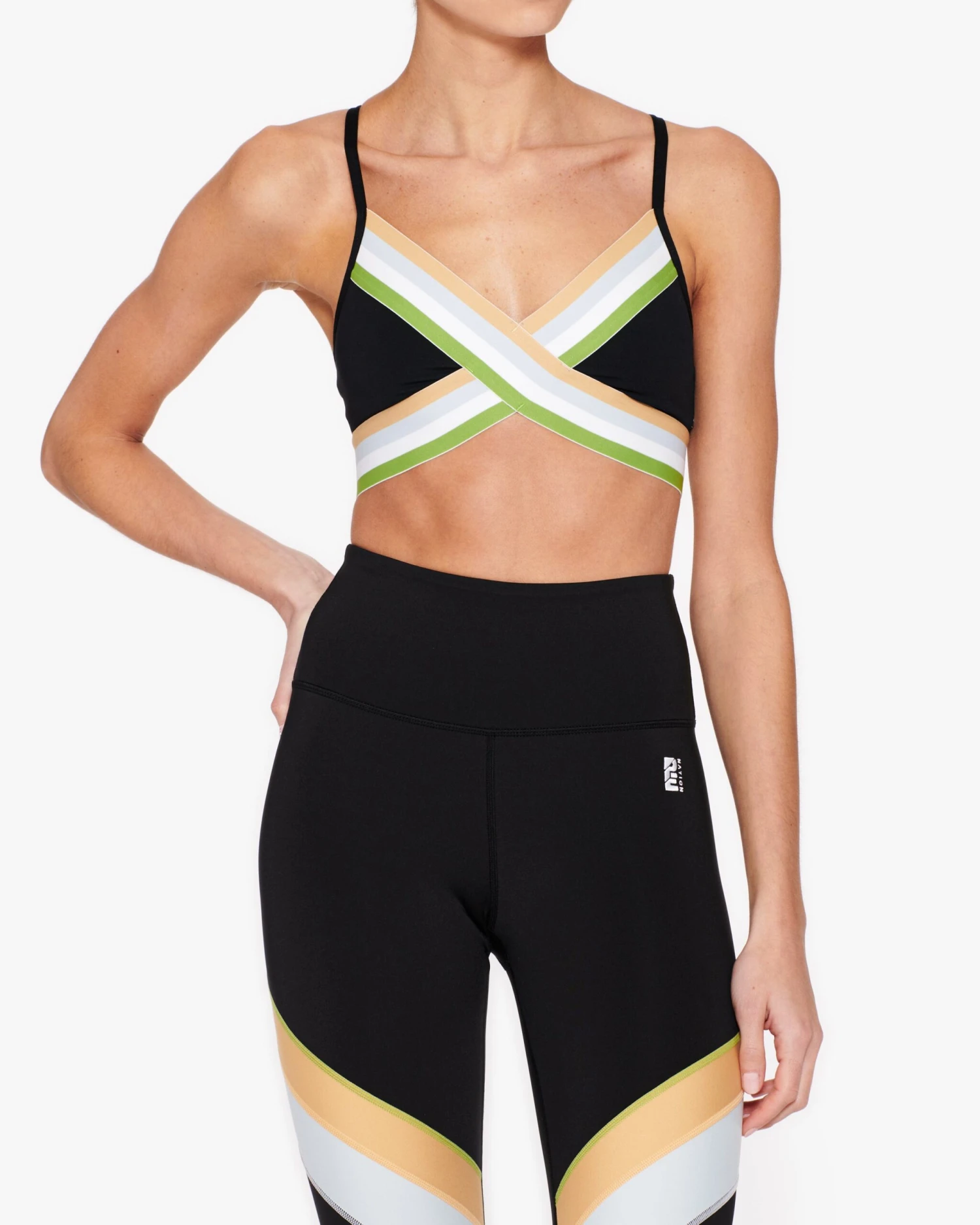 FITTED CROSS BACK SPORTS BRA.ADJUSTABLE THIN CROSS STRAP DETAIL ON BACK WITH GOLD METAL SLIDERS. STRIPE ELASTIC DETAIL AT HEM AND ALONG BUST. P.E NATION WOVEN PATCH AT SIDE SEAM, MADE IN A TECHNICAL, COMPRESSIVE, PERFORMANCE FABRICATION. DESIGNED FOR LOW IMPACT ACTIVITY.