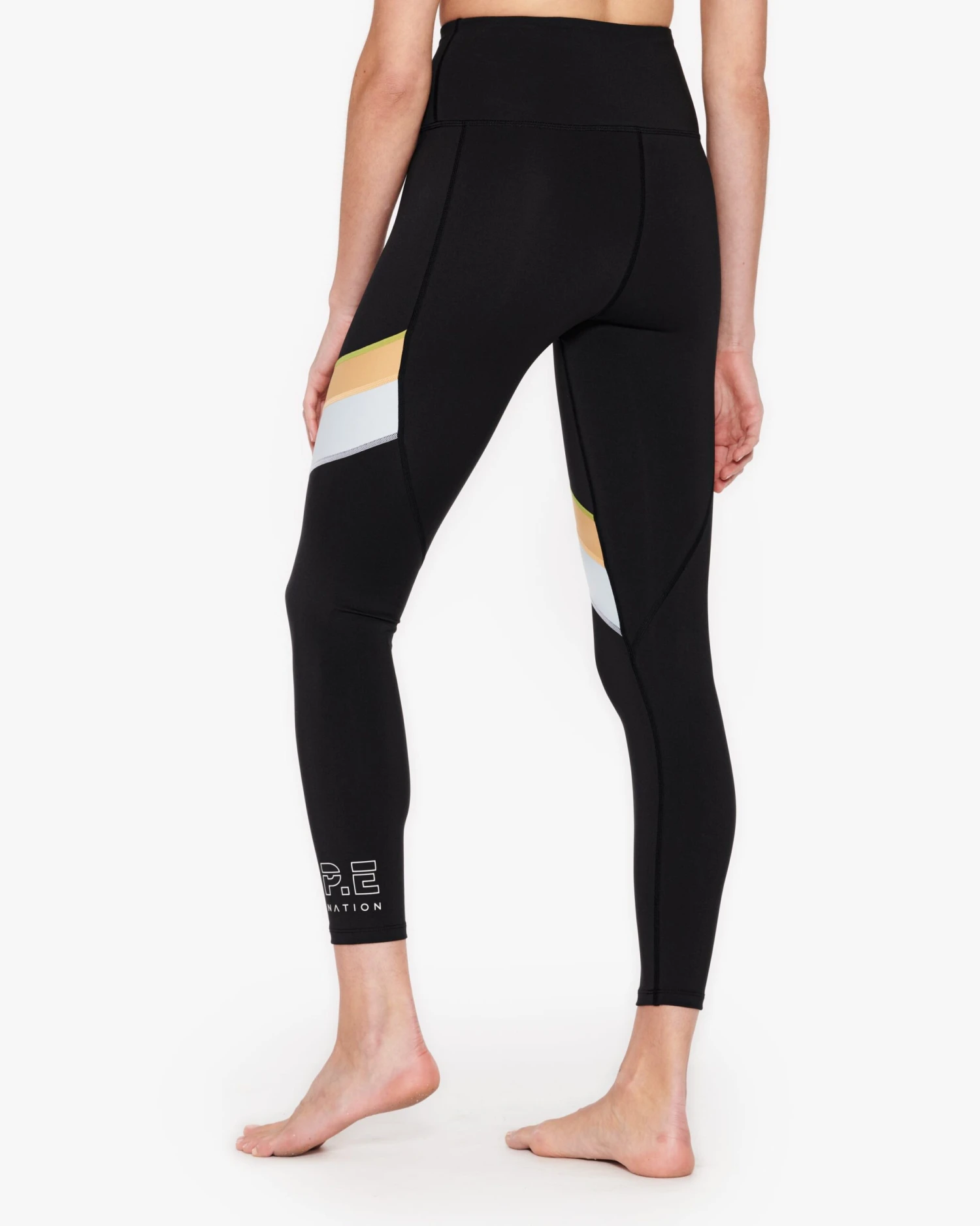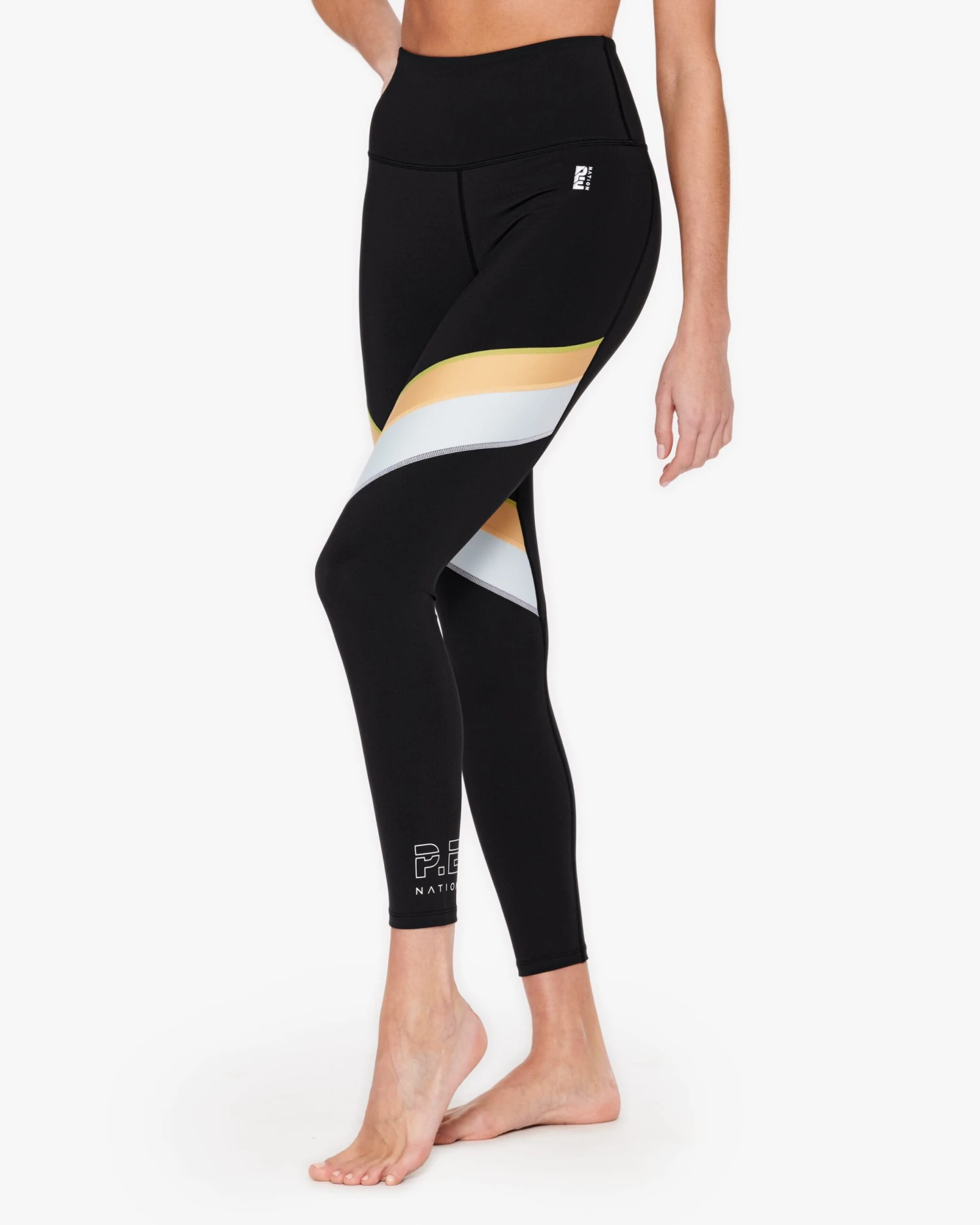 HIGH RISE 7/8 LEGGING, BUILT-IN WAISTBAND FOR EXTRA SUPPORT, CONTRAST PANELS IN LEG, P.E NATION EMBROIDERY ON HIP. P.E NATION LOGO PRINT ON ANKLE. .MADE IN A SOFT, COMPRESSIVE, RECYCLED POLYESTER FABRICATION. SQUAD PROOF. DESIGNED FOR RUNNING, HIIT, EVERYDAY WEAR.