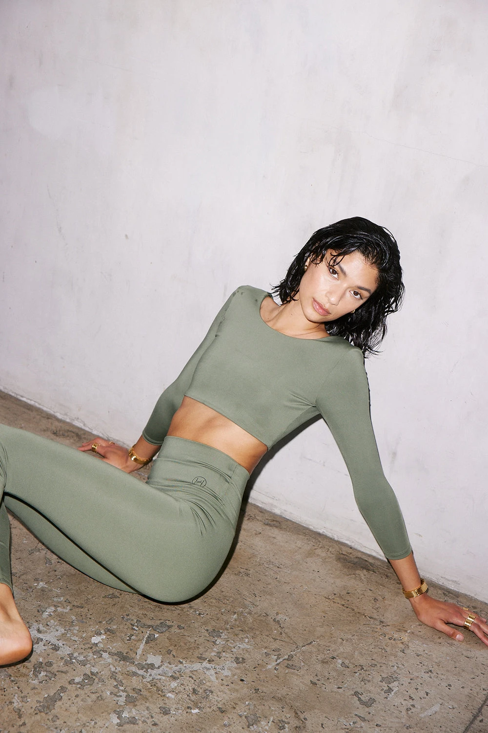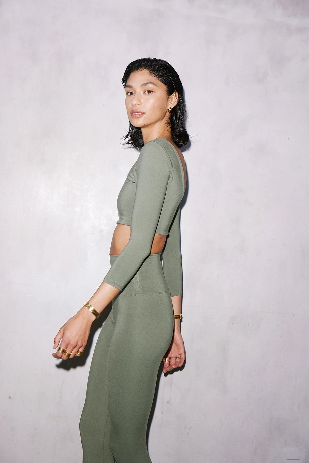 The Ballerina. Featuring a cropped body, scooped front neckline, flattering low back, and quarter-length sleeves. The Ballerina pairs back perfectly with The High Leggings in army. Designed for low to medium-intensity workouts.